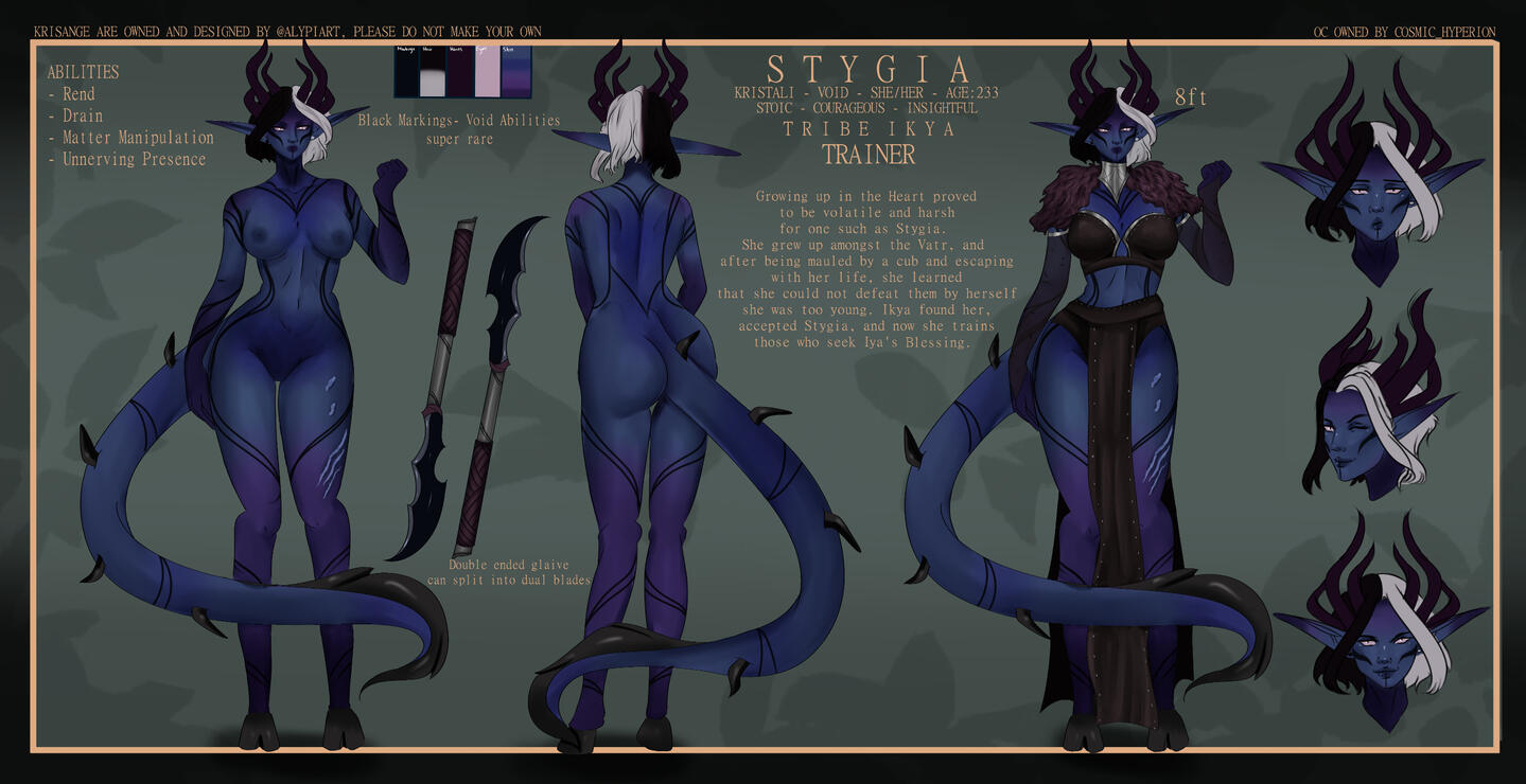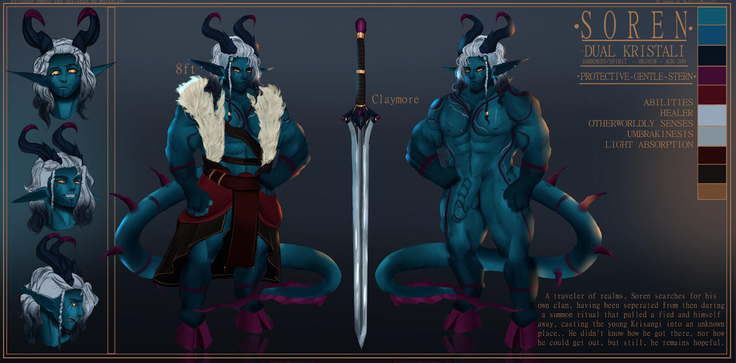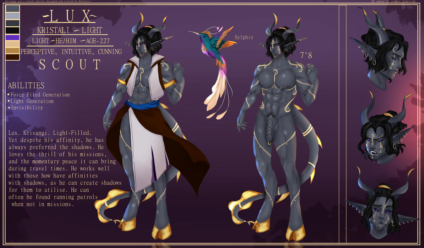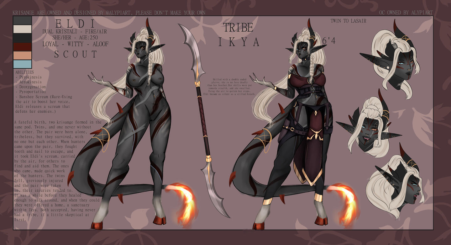 When one falls, their death becomes life, and bleeds into the ground beneath them, causing Kristali to grow around them. That very same life energy splits into each Kristalis, and within each, a child will begin to grow. Each pod never contains more than six Kristali and rarely less. A Fallen will never see the newborns, and once the life transference is complete, the Fallen will return to the ground, crystalline flowers sprouting where they once were.It takes 14 months to fully form, from embryo to adulthood, but that does not mean the newborns will immediately hatch. Some arrive instantly, but some may take years to exit their Kristalis. They are aware of their surroundings, and will only hatch when they feel safe to do so. If by this time, a tribe has moved on, a few Krisângi will be left behind to watch over the newborns, and will either find their tribe again, or begin a new one.While the Krisânge vary wildly in appearance, there are common grounds.All are born hornless, and all will grow horns.Their skin tones tend to take on colours of their surroundings, which also decide which Kristali a Krisângi has.They may take on certain attributes of wherever they're born. For instance, if their Kristalis grows in a patch of ink cap mushrooms, the Krisânge may take on their colours, the textures and so on and so forth. The reason for this is even though the Fallen would have returned to the ground, the Kristalis still draw life from their surroundings, from the trees, the ground, even the rain and the sky. Nature itself fuels the newborns.When their horns grow in, they are almost always crystal tipped, which with age will begin to envelop the rest of the horns, until the "bone" is no longer visible.Krisânge are a hoofed species, and much like their horns, these hooves are crystalline. They have a somewhat natural glow.Their tails are thick and are lined with crystal spines, ending in a unique shape. Nature helps form the newborns, and so it is never known what it will look like.Being an almost entirely crystalline species, their very skeletons are made of the same material as their Kristalis, horns and hooves. This enables the spines to grow through the tail, the horns to grow, and the hooves they walk on. The crystal armor that forms over their bodies when injured comes from the skeleton growing through open wounds, and forming over the skin, giving an extra boost against damage. That being said, this exposed skeleton is sensitive to cold, and once exposed, may come brittle, easy to break.Blood is opalescent, a pearl like colour, only really shining when light is shone onto it. This blood holds a universal antidote, which gives the Krisânge a natural resistance to poisons, usually naturally occurring ones. Given enough exposure, they can become resistant to chemical based ones.Once a Krisângi surpasses a certain age, a new ability will begin to manifest. Usually it comes with a stronger connection to their element, better manipulation over it. This stronger connection allows the Krisângi to become one with their element, lose their physical form, and become an elemental. This is a last resort ability, usually if a Krisângi is close to death, and their tribe close to being wiped out. This elemental form will destroy any and all adversaries in their path, and when all are destroyed, it will become a dormant protector. This protector will follow their tribe, and may exist for millenia. There have been no known cases of an Elemental returning to their physical form.Markings depict which element a Krisângi has control over, Indigo for Air, Green for Earth, Vermillon for Fire, Cerulean for Water, Gold for Light, Violet for Darkness and White for Spirit. These begin to form over the body with reckless abandon, becoming more intricate with more power.Air, Earth, Fire and Water Krisânge are the most common, and many tribes are formed of these.Light Krisânge are only born when a Kristalis forms over holy ground, or when a Celestial has been there.Spirit Krisânge are the rarest, and are often born when Death has encompassed the area where their Kristalis forms.Darkness, a type seen as evil, seen as the stain, are rare, somehow able to find their ways into Shadow WorldsRarer than Spirit, sometimes, A Krisângi is born with a Dual Kristali, and will gain control over two elements. Their control over these elements may be weaker than that of a normal Krisângi, they may have more control over one than the other.