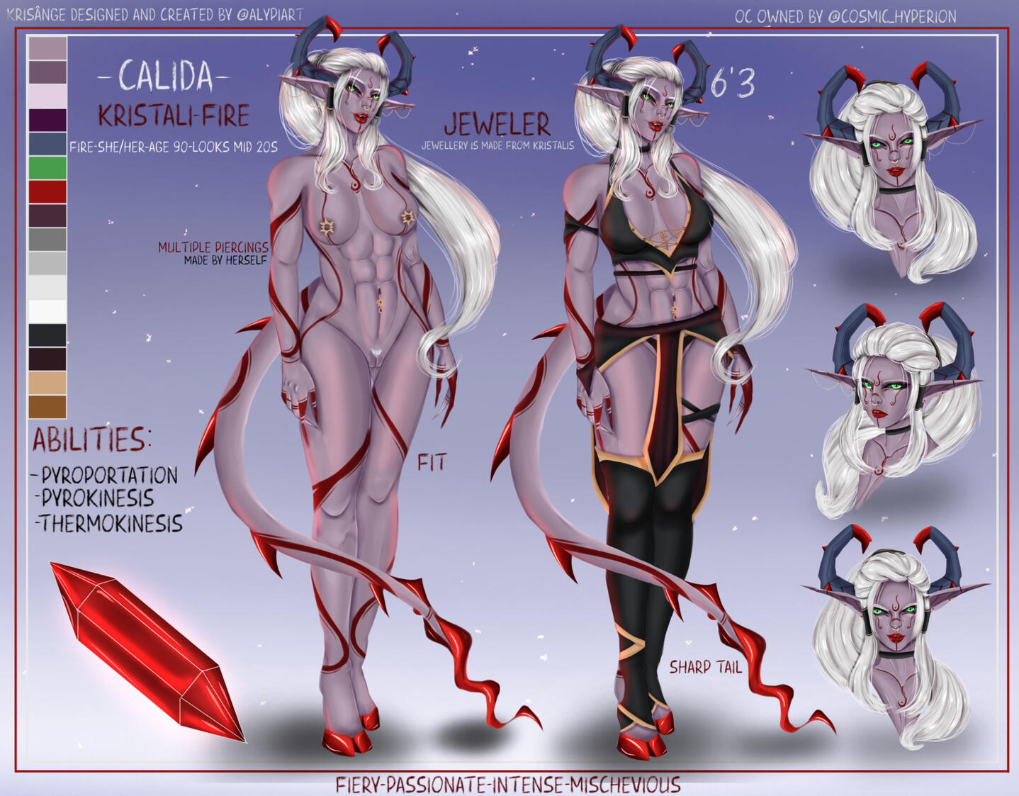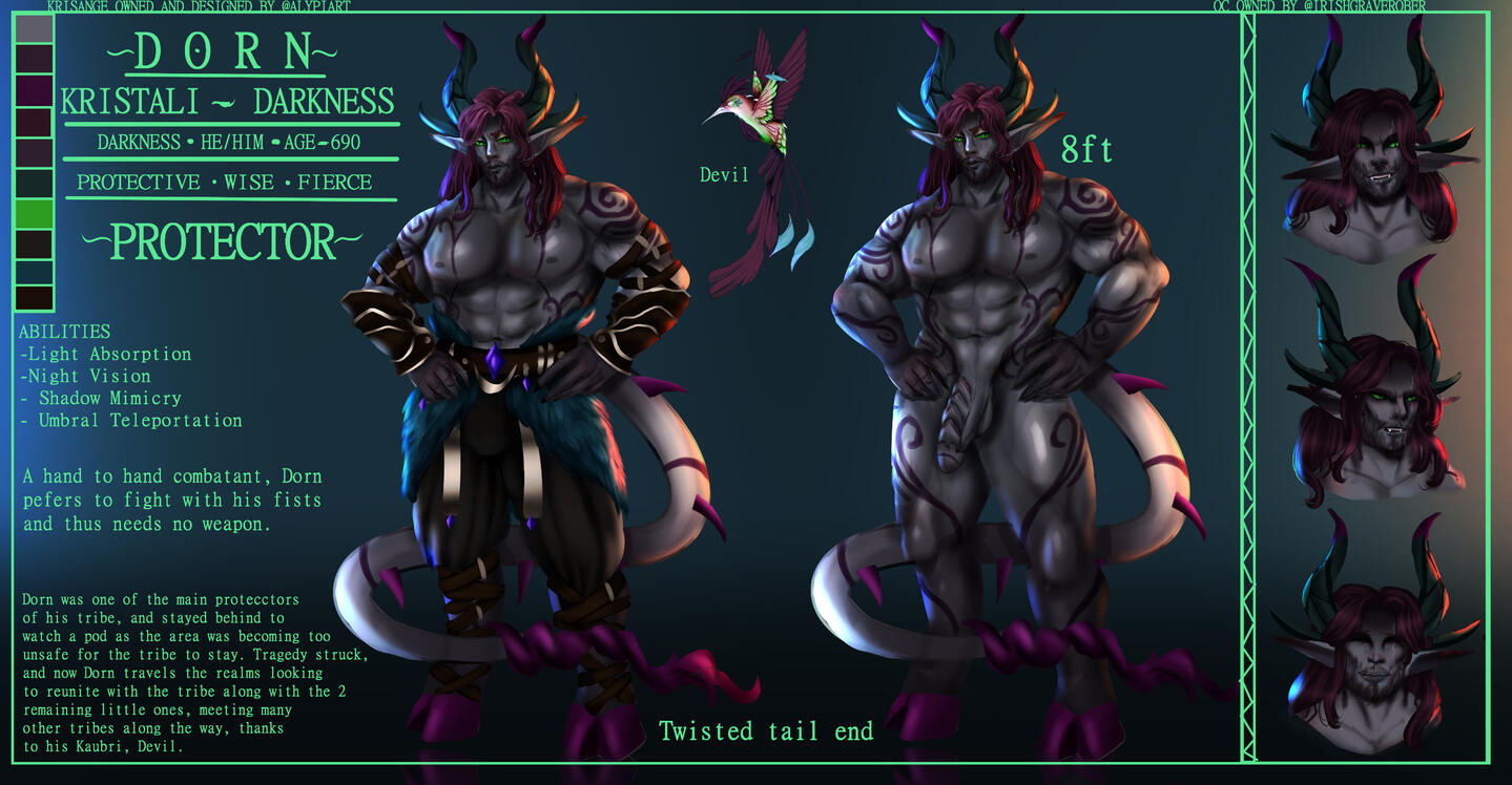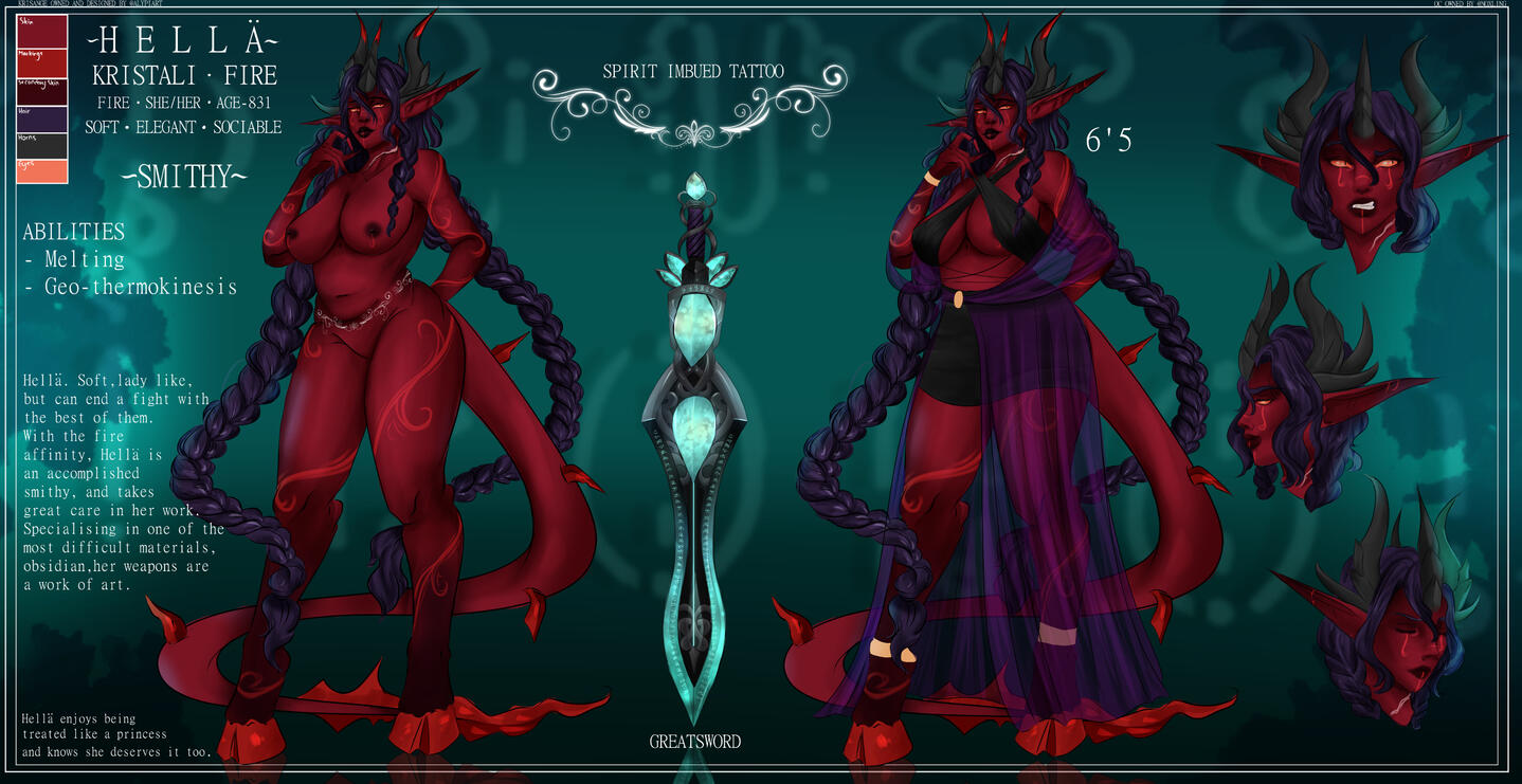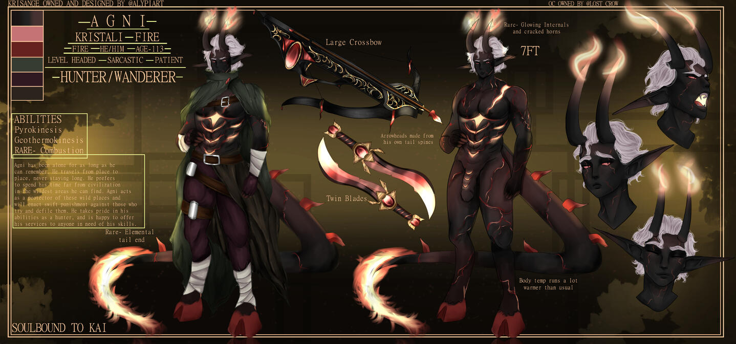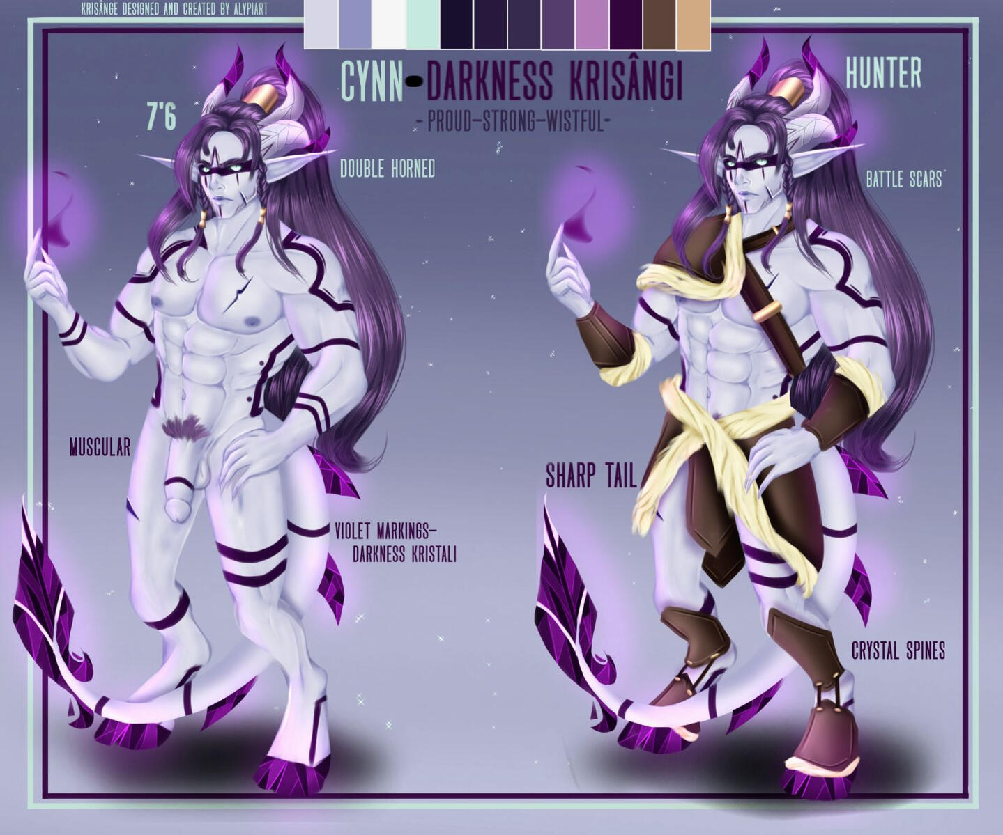 When one falls, their death becomes life, and bleeds into the ground beneath them, causing Kristali to grow around them. That very same life energy splits into each Kristalis, and within each, a child will begin to grow. Each pod never contains more than six Kristali and rarely less. A Fallen will never see the newborns, and once the life transference is complete, the Fallen will return to the ground, crystalline flowers sprouting where they once were.It takes 14 months to fully form, from embryo to adulthood, but that does not mean the newborns will immediately hatch. Some arrive instantly, but some may take years to exit their Kristalis. They are aware of their surroundings, and will only hatch when they feel safe to do so. If by this time, a tribe has moved on, a few Krisângi will be left behind to watch over the newborns, and will either find their tribe again, or begin a new one.While the Krisânge vary wildly in appearance, there are common grounds.All are born hornless, and all will grow horns.Their skin tones tend to take on colours of their surroundings, which also decide which Kristali a Krisângi has.They may take on certain attributes of wherever they're born. For instance, if their Kristalis grows in a patch of ink cap mushrooms, the Krisânge may take on their colours, the textures and so on and so forth. The reason for this is even though the Fallen would have returned to the ground, the Kristalis still draw life from their surroundings, from the trees, the ground, even the rain and the sky. Nature itself fuels the newborns.When their horns grow in, they are almost always crystal tipped, which with age will begin to envelop the rest of the horns, until the "bone" is no longer visible.Krisânge are a hoofed species, and much like their horns, these hooves are crystalline. They have a somewhat natural glow.Their tails are thick and are lined with crystal spines, ending in a unique shape. Nature helps form the newborns, and so it is never known what it will look like.Being an almost entirely crystalline species, their very skeletons are made of the same material as their Kristalis, horns and hooves. This enables the spines to grow through the tail, the horns to grow, and the hooves they walk on. The crystal armor that forms over their bodies when injured comes from the skeleton growing through open wounds, and forming over the skin, giving an extra boost against damage. That being said, this exposed skeleton is sensitive to cold, and once exposed, may come brittle, easy to break.Blood is opalescent, a pearl like colour, only really shining when light is shone onto it. This blood holds a universal antidote, which gives the Krisânge a natural resistance to poisons, usually naturally occurring ones. Given enough exposure, they can become resistant to chemical based ones.Once a Krisângi surpasses a certain age, a new ability will begin to manifest. Usually it comes with a stronger connection to their element, better manipulation over it. This stronger connection allows the Krisângi to become one with their element, lose their physical form, and become an elemental. This is a last resort ability, usually if a Krisângi is close to death, and their tribe close to being wiped out. This elemental form will destroy any and all adversaries in their path, and when all are destroyed, it will become a dormant protector. This protector will follow their tribe, and may exist for millenia. There have been no known cases of an Elemental returning to their physical form.Markings depict which element a Krisângi has control over, Indigo for Air, Green for Earth, Vermillon for Fire, Cerulean for Water, Gold for Light, Violet for Darkness and White for Spirit. These begin to form over the body with reckless abandon, becoming more intricate with more power.Air, Earth, Fire and Water Krisânge are the most common, and many tribes are formed of these.Light Krisânge are only born when a Kristalis forms over holy ground, or when a Celestial has been there.Spirit Krisânge are the rarest, and are often born when Death has encompassed the area where their Kristalis forms.Darkness, a type seen as evil, seen as the stain, are rare, somehow able to find their ways into Shadow WorldsRarer than Spirit, sometimes, A Krisângi is born with a Dual Kristali, and will gain control over two elements. Their control over these elements may be weaker than that of a normal Krisângi, they may have more control over one than the other.